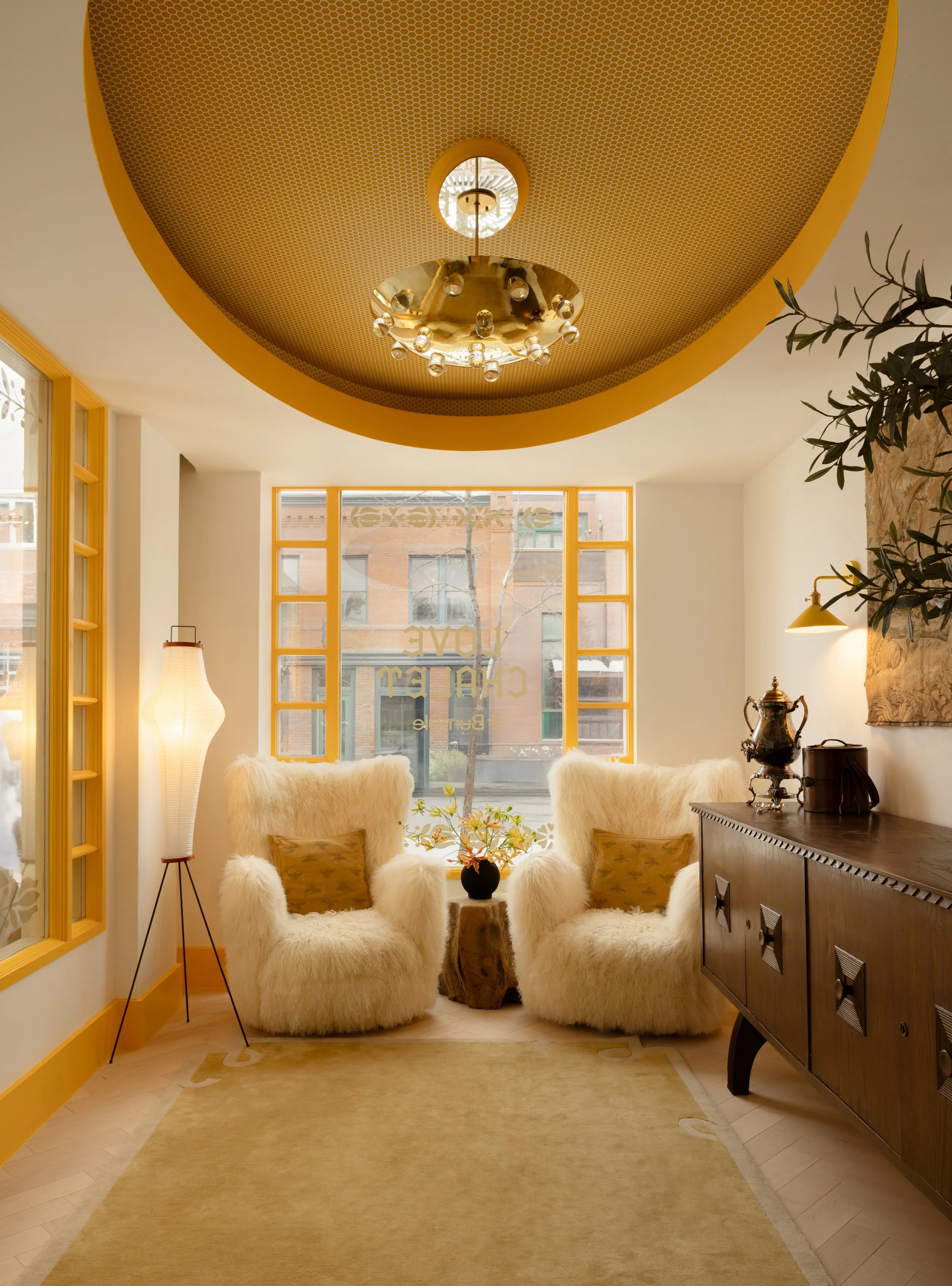 Bumble’s winter Aspen pop-up required a three week turn around in order to open for the holiday season. The long, narrow spaces were tied together by the signature Bumble yellow painted baseboards and trims.